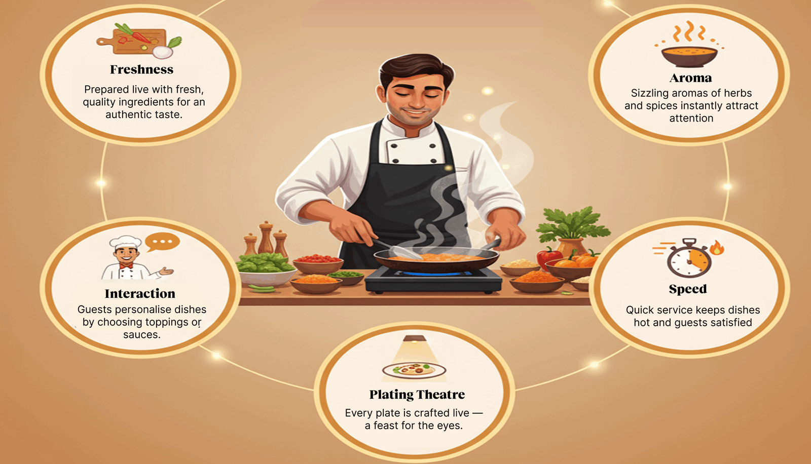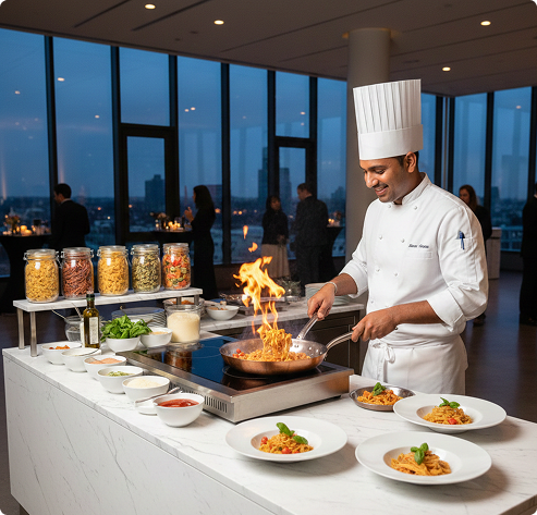 A live food counter is literally what it is made out to be: food prepared in front of the guests in real time. It is a combination of theatre and gastronomy, during which the chefs bring the ingredients to life through sound, smell, and artistry. Live counters can be used to establish an interactive relationship between the kitchen and the guest, besides tossing pasta in Parmesan wheels or putting together a fresh Caesar salad bar.