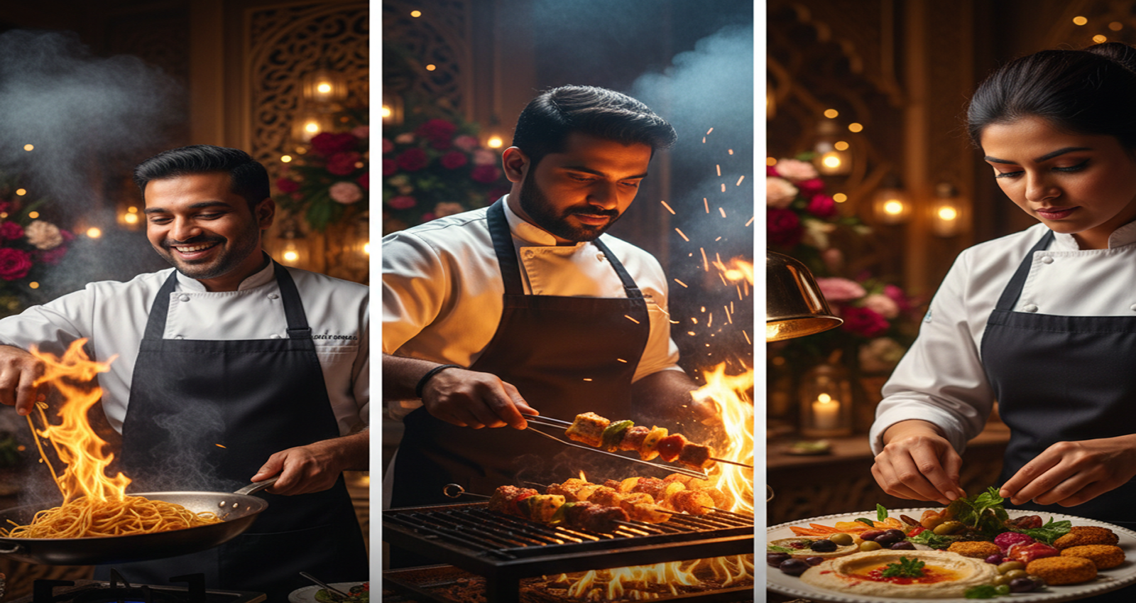 - Interactive Experience: Guests enjoy the show – the action of the chefs throwing pasta, grilling kebabs, or placing mezze dishes on the table gives the party an exhilarating activity