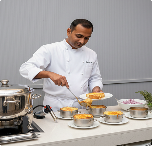- French Onion Soup Station: Freshly caramelised onions and gratinated toppings.