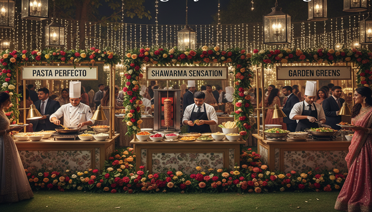 Food is the heart of any party, and live counters make it an experience to be shared. Premium Indian weddings are characterised by Mediterranean and continental live counters, which are very fresh, interactive and international. Starting with a pasta live stand, then a shawarma booth, or baklava catering, both establishments build a classy, intimate narrative that guests will never forget, even after the party is over.