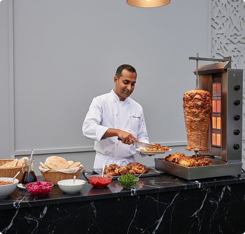 - Carving & Shawarma Station: Includes Chicken Shawarma, Shish Tawook, Kofta, and Whole Roasted Chicken.