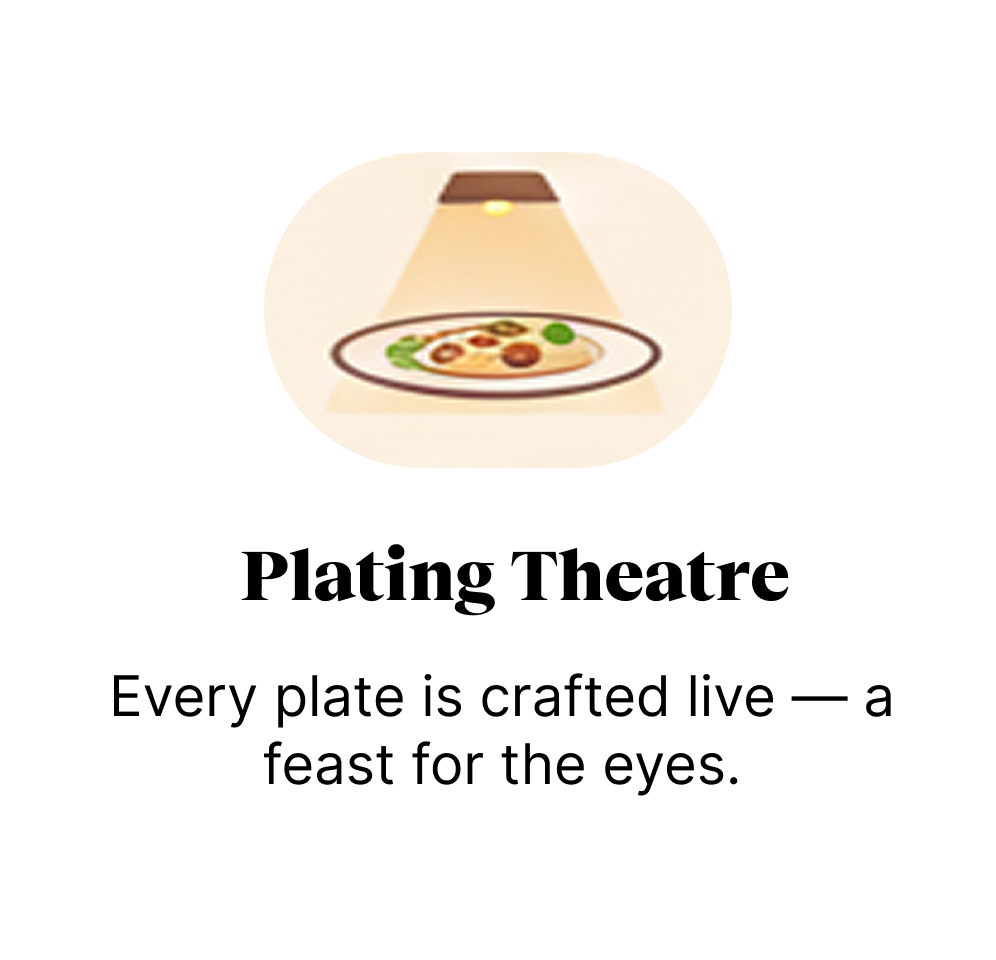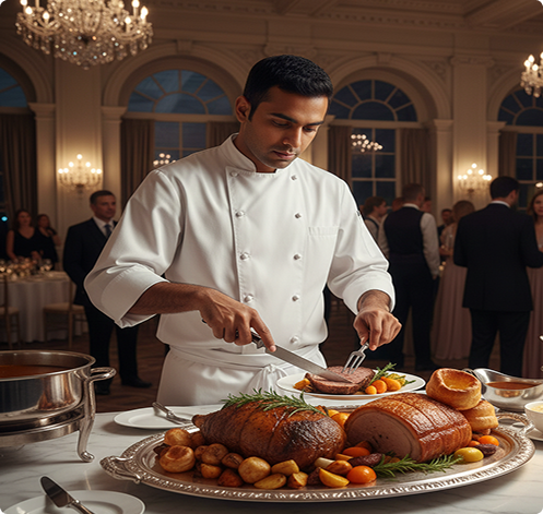 - Flambé Station: Crepes Suzette and live-fired presentations; steak-based flambé optional.