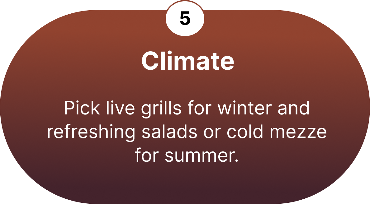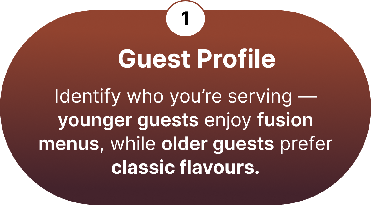 Identify who you’re serving — younger guests enjoy fusion menus, while older guests prefer classic flavours.